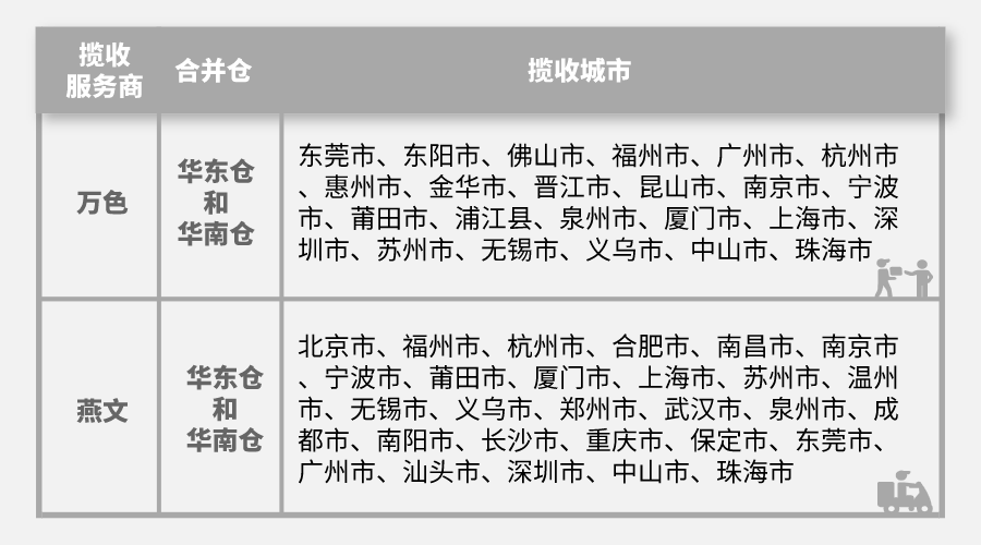 两个物流服务商提供揽收服务的范围各有不同,基本覆盖了国内重点跨境电商城市,且都支持这些城市(地区)揽收发往华东合并仓和华南合并仓的服务。尤其是浙江省、广东省、福建省等跨境商户集聚的重点区域。