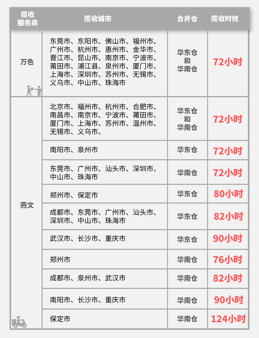 所谓揽收时效,是指从揽收扫描节点到到达合并仓节点的时间。对于大部分揽收城市,揽收时效都在72小时内。但燕文的部分城市的揽收时效略有不同,比如对于南阳市的揽收,如果是寄送至华东仓,那么揽收时效是72小时,而如果是寄往华南仓,揽收时效是90小时。