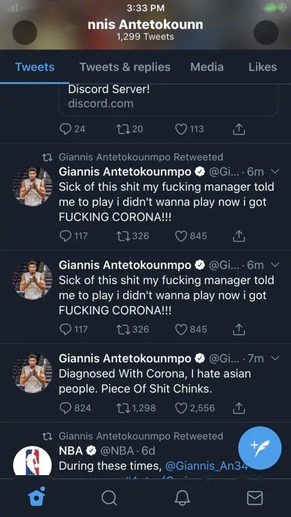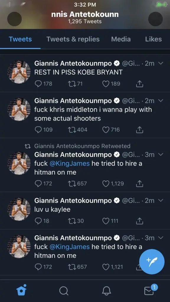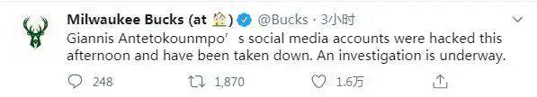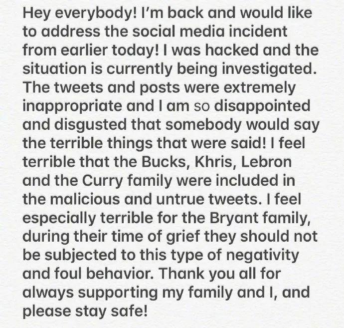 "我的账号遭遇黑客攻击,此事目前正在调查中。此前推特的内容是非常不恰当的,我对有人能说出这种话而感到失望和厌恶。我为此对雄鹿队、米德尔顿、詹姆斯以及库里及家人被恶意和不实的内容中伤而感到抱歉。对科比一家我感到尤为抱歉,仍处悲痛的他们不应该受到这种消极和负面的影响。谢谢你们一直支持我和我的家人,望平安!"