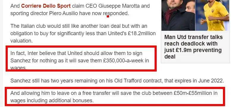 国米指出,允许桑切斯自由转会,不仅可以促进他离队,也能为红魔俱乐部节省5000万至5500万英镑的年薪。