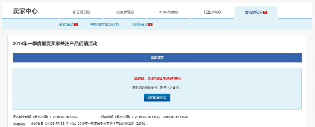 可能原因是您在【活动报名】阶段提交的listing的相关信息全部未能通过eBay的审核(例如:活动价格、库存数量等),那您就参加不了这个活动了。这条活动的信息会被归纳到【卖家中心】【营销活动】选项卡中的【已结束的活动】板块中,在【已结束的活动】板块中,可以点击相应的活动查看详情。当前这个案例,即显示该卖家提交的listing,未能通过eBay的审核。