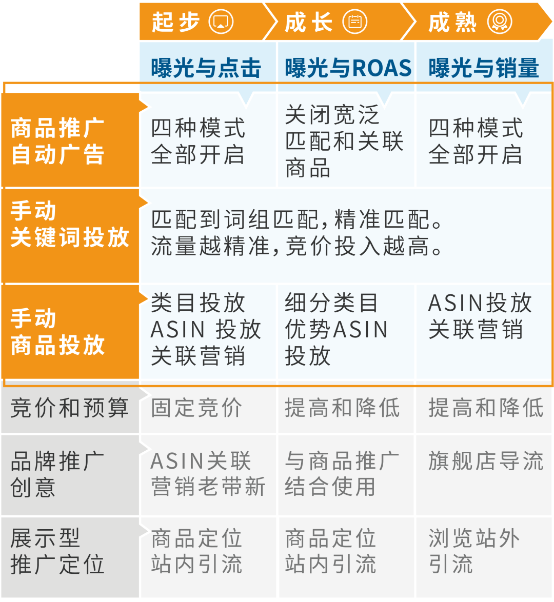 ✔ 以下爆款打造三阶段(起步、成长、成熟)广告策略总览图: