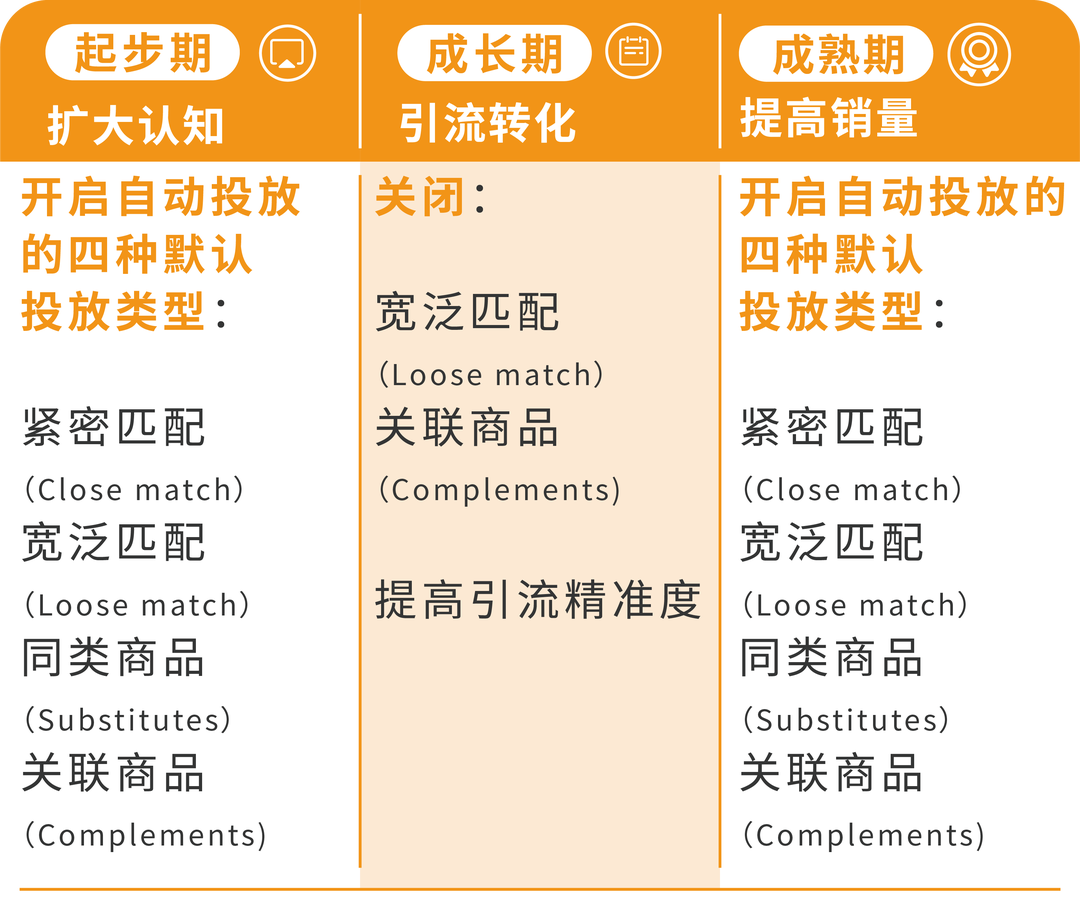 成长期,系统已对Listing十分了解,抓取了大量关键词,可以尝试关闭宽泛匹配,提高引流精准度,如果流量没有明显的下降,那说明通过紧密匹配也可以带来稳定的流量。