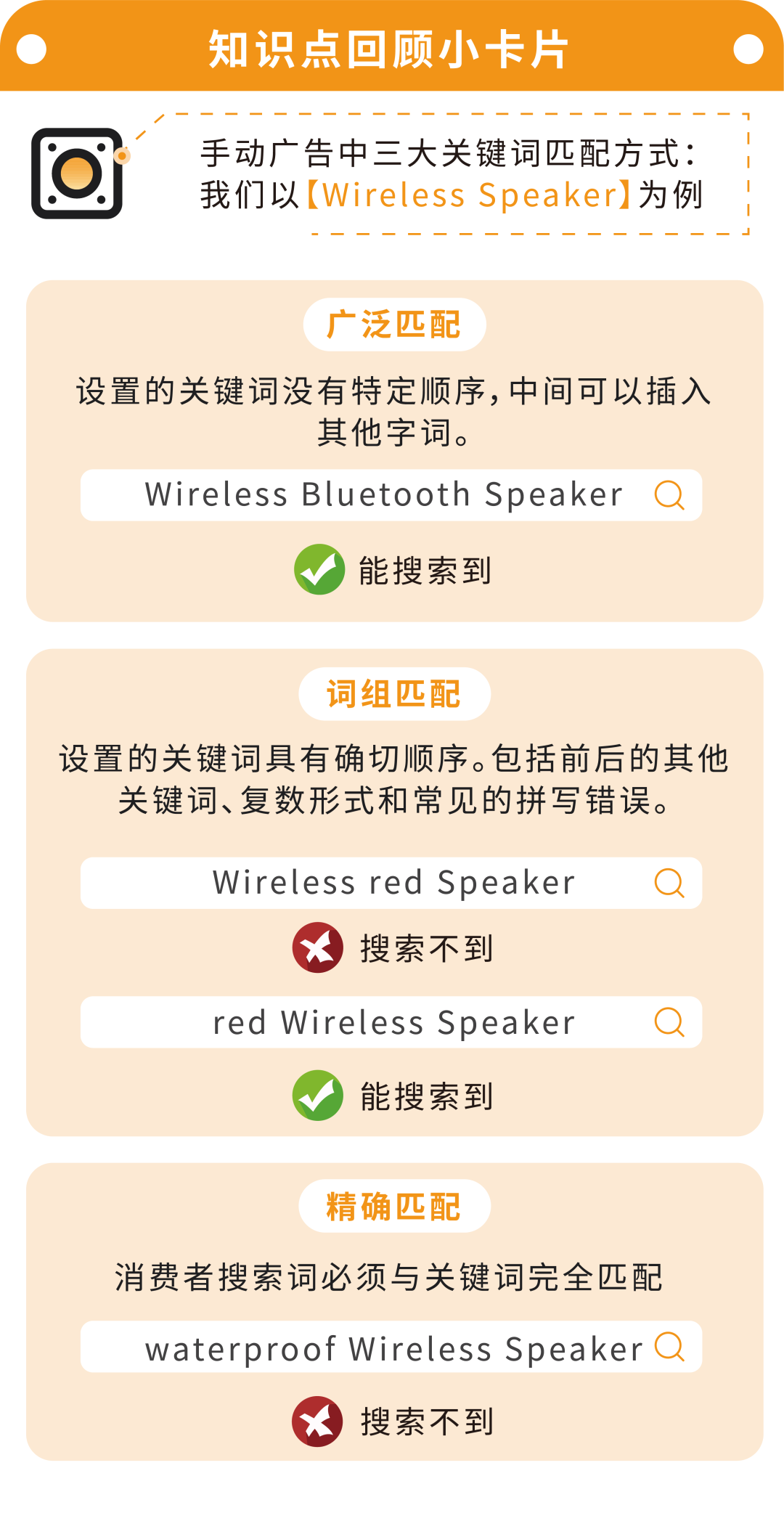 ✔ 举例①:在广泛匹配投放关键词"+men shoes"时,只有包括"men"的搜索词会被匹配,比如"men sneakers", 但不会匹配"running shoes"。
