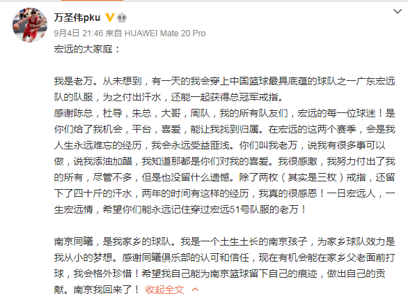 9月4日,万圣伟发了离队微博,感谢广东宏远多年来的栽培。