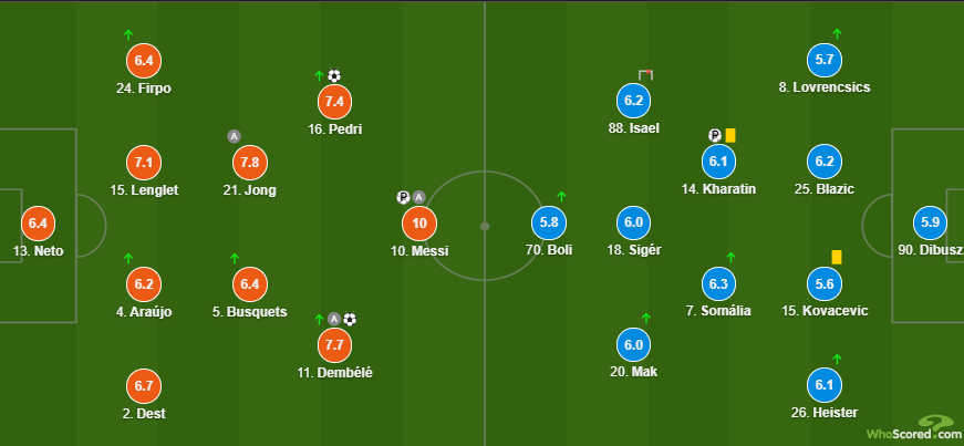 第70分钟,皮克吃到红点套餐,哈拉丁点射扳回一城,费伦茨瓦罗斯1-3追回一球。悲剧的是,欧冠小组赛第2轮,巴萨将在客场对阵尤文,皮克将无缘本场比赛。第85分钟,梅西传球,登贝莱利用超快的速度杀入禁区右侧底线处,倒三角助攻佩德里进球,巴萨4-1!第90分钟,巴萨外围传球给禁区内,梅西接球摆脱分禁区右侧,空挡位置登贝莱接球打门入网,巴萨5-1锁定胜局!赛后,几乎参与全部威胁的梅西又获得了10分。