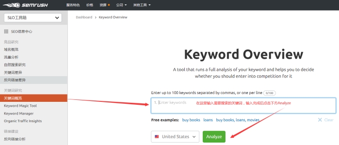 当您在SEMrush关键字概览工具的搜索框输入关键字,获得概述报告时,SEMrush将为您提供关键字价值的初步评估。