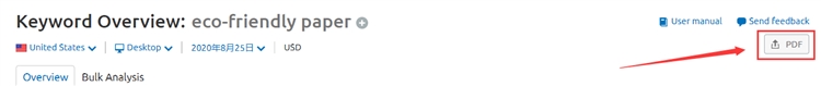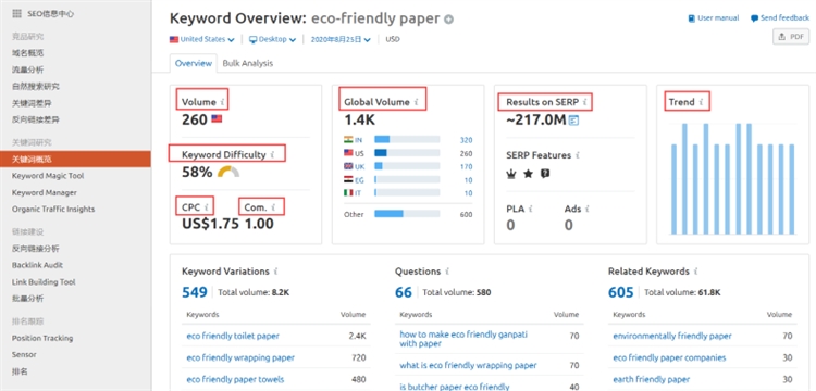 这里我们以环保的包装纸(eco-friendly paper)为案例模板,用SEMrush Keyword Overview工具帮我们获取需要的信息和谷歌SEO优化的数据参考。