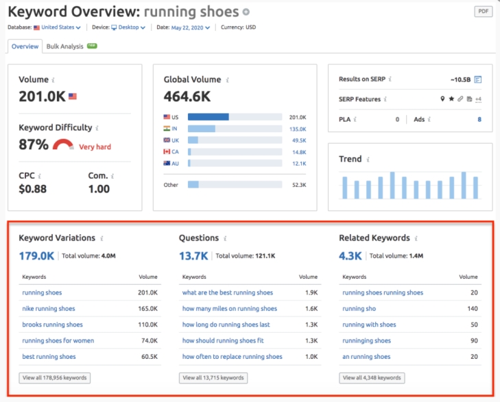 在SEMrush关键字概览工具中输入关键字,获得概述报告后,您可以根据报告的数据对其进行挖掘以找到理想的目标关键字。