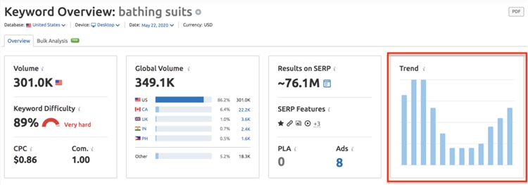 例如,在春季和夏季,"泳衣"之类的关键字可能会趋向较高。作为网站,您可以制定季节性网站内容或针对该关键字的广告系列策略。