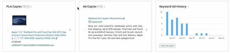 "关键字广告历史记录"将显示在过去的12个月内,网站在地区范围内如何积极地对该关键字进行出价。点击它您将转到"关键字广告历史记录"报告,该报告将提供更多信息。