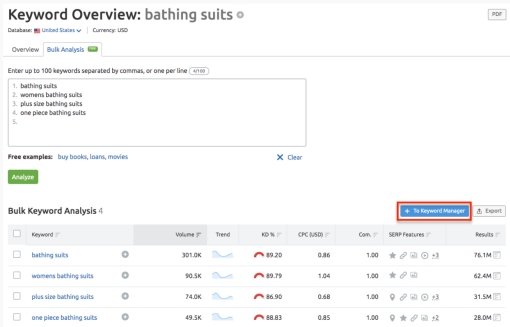 关键字之间做完比较之后,将最适合您的SEO策略的关键字发送到关键字管理器,这是使用不同SEMrush工具收集的所有关键字的关键字存储库,方便以后查询。