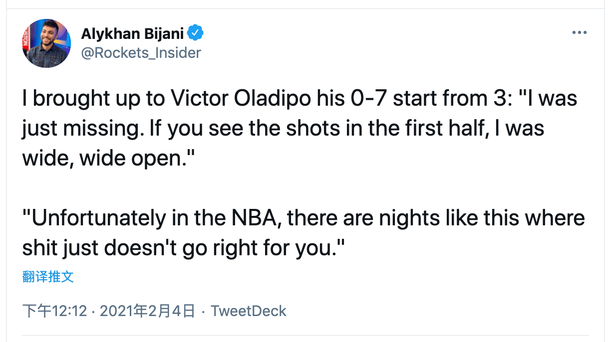 奥拉迪波也谈及自己在对阵雷霆那场比赛的挣扎表现: