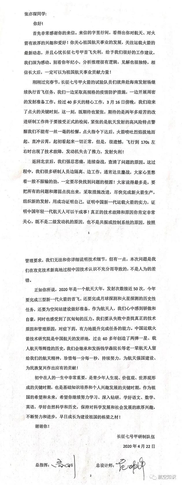 来源:央视新闻客户端 3月12日 长征七号改遥二运载火箭成功发射 但其实 中国的航天事业并非一帆风顺 2020年3月16日 我国长征七号改中型运载火箭 发射任务失利 看到这个消息后 一位有着航天梦的初中生 非常难过和着急 他利用课上课下积累的知识 给科研人员寄了一封信 讲述了自己对于长七失利原因的分析 ↓↓↓ 在信件寄出约一周后 长征七号总设计师范瑞祥 和长征七号