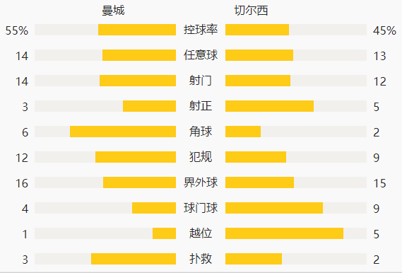 全场比赛结束,曼城主场1-2不敌切尔西。