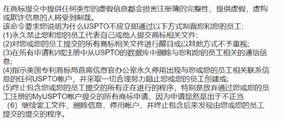而根据美国法律,严厉打击商标注册过程中的欺诈行为,如果非法申请美国商标,即使深圳这家知识产权公司已经申请下来的生效商标,也会被追溯、被撤销。作为惩罚,目前深圳这家知识产权公司,已经被终止所有提交的商标申请了。