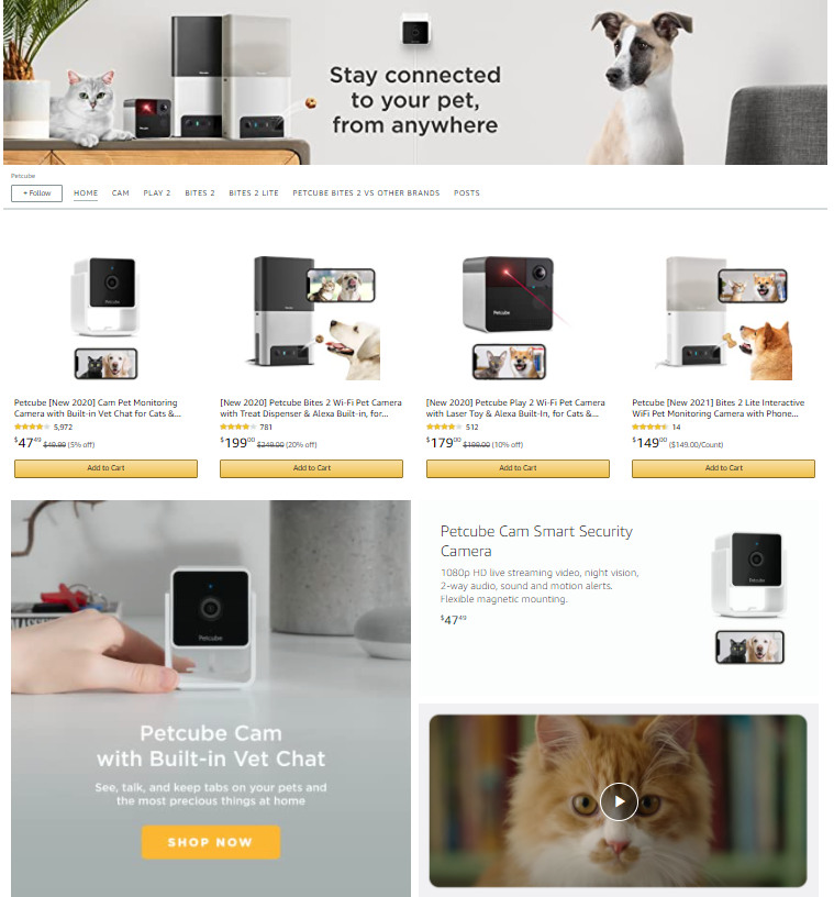 Petcube 的 亚马逊品牌旗舰店是特定市场品牌的典型例子(合适专注某一类目的卖家参考)。通过使用周到的设计,购物者可以清楚地展示 Petcube 产品的工作原理。图像和关键特征之间的平衡是准确的,更不用说大量可爱的狗和猫了。Petcube 的 亚马逊品牌旗舰店以最好的方式提供图形和信息。