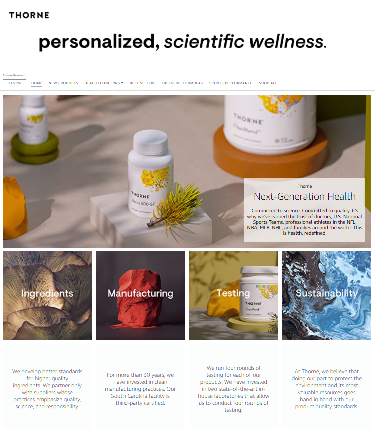 THORNE能让普通的维生素购物提升到一个新的水平。该品牌的标志是聚焦,然后是分享 THORNE 的使命宣言和创造他们产品的研究。虽然这种设计与亚马逊上其他维生素品牌的竞争不同,但它们通过视频、产品摄影和分享不同轮次的产品测试而脱颖而出——帮助购物者对他们的购买充满信心。