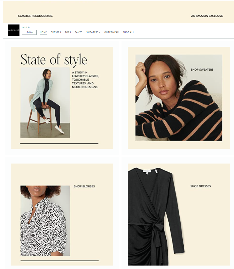 如果你需要一个精明的品牌来设计一个与主要客户产生共鸣的 亚马逊品牌旗舰店,这个非常值得借鉴,特别是服装类。一登陆Lark & Ro 的亚马逊页面,非常简洁,但是配合温暖动感的调色板散发出经典和专业的风格。精美的品牌图片和引人入胜的使命宣言会邀请你花更多时间浏览他们的服装。