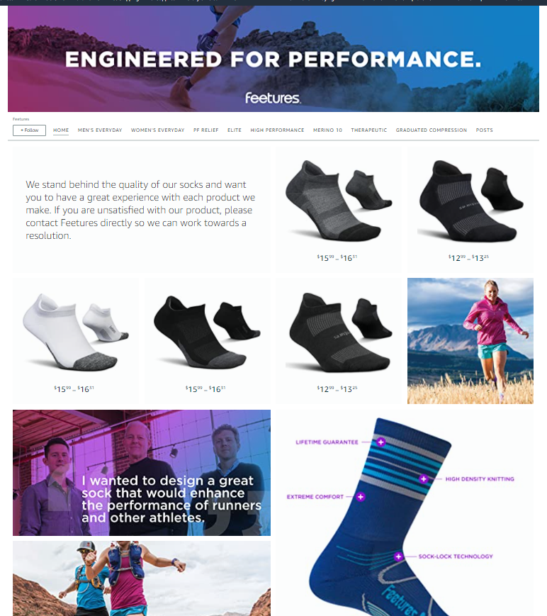 在为跑步者和运动员销售袜子时,Feetures的 亚马逊品牌旗舰店值得获得参考。生活方式照片和充满活力的配色方案让购物者立即感受到该品牌。紧凑的网格展示了不同的袜子设计,强调了它们的低价。在网格的顶部,Feetures 进行了自我介绍——进一步与购物者建立信任。
