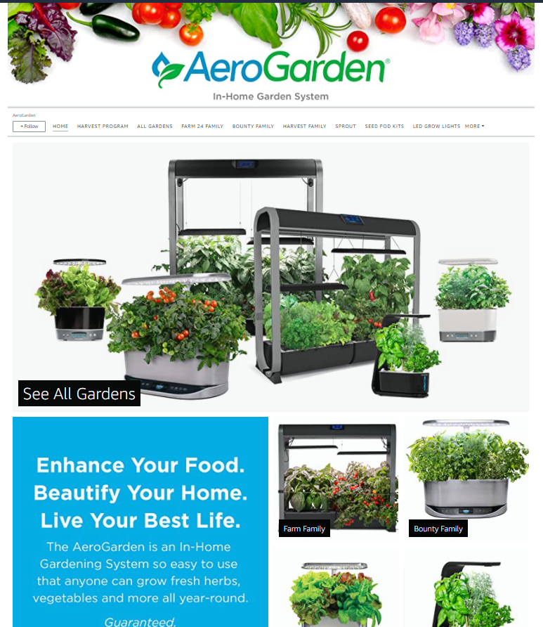这是比较有趣的产品,他们的亚马逊品牌旗舰店激励消费者培养他们在家中的园艺技能与布局。在整个页面的设计中,他们的产品占据了中心位置。突出的产品推荐与"自然增长"的声明相结合,营造出一种鼓励购物者尝试新鲜事物的氛围。