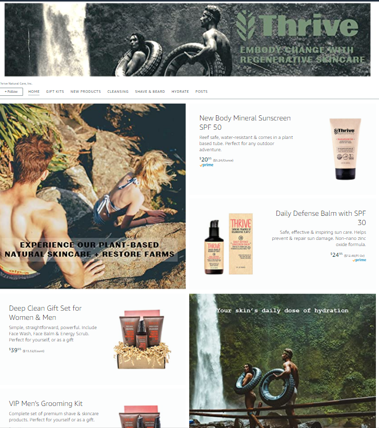 第一印象很重要。这是户外护理产品店铺,Thrive出色地通过引人注目的生活方式图片和大胆的泥土色调吸引了潜在客户的注意力。在购物者需要向下滚动之前,产品线会显示在两个推荐旁边。在店面的下方,Thrive 分享了有关其产品的更多详细信息,并提供了一个简单的清单。这家 亚马逊品牌旗舰店使购买美容必需品成为一种简单而直观的体验。