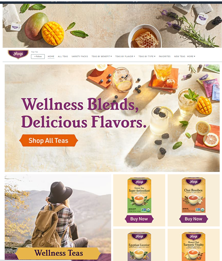 瑜伽茶,没有什么比一杯温暖、芳香的茶更让人舒心的了,Yogi 的 亚马逊品牌旗舰店在他们的虚拟店面上无缝地诠释了这种感觉。一个优秀的商店横幅伴随着舒适、季节性的图像和直观的产品类别。Yogi 对其 亚马逊品牌旗舰店的执行让购物者在喝一口之前就可以直观地体验他们的产品。