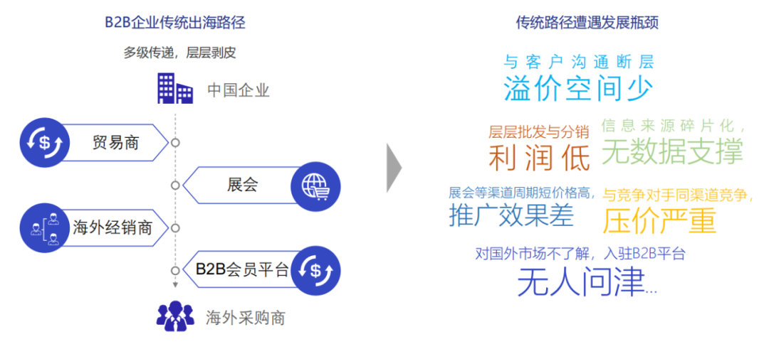 随着疫情席卷全球,受疫情、国际贸易摩擦等因素影响,国内企业出海遭遇阻力。一些观点认为,目前中国企业出海,已经到了"深水区",竞争压力越来越大,如何杀出重围,对所有的中企来说,都是不小的考验。从疫情影响来看,受冲击最大的,是那些一直以来完全依赖于第三方,缺乏自有品牌及用户积累的传统外贸B2B企业。
