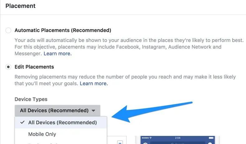 在这些展示位置中,你有三种不同的设备类型选项可供你投放广告:
