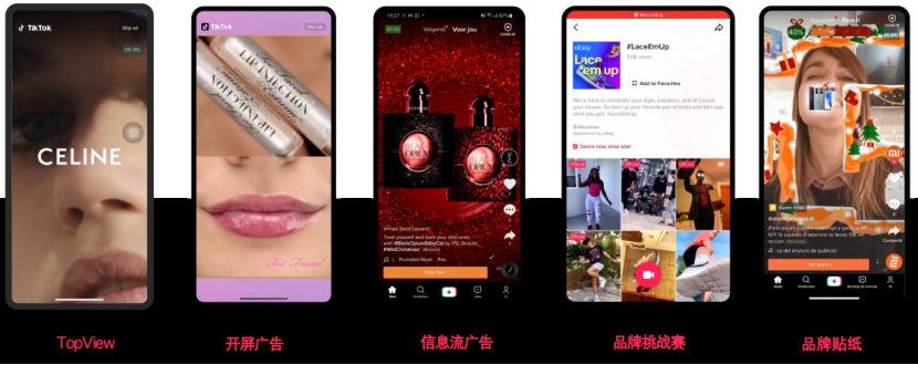 TikTok 营销服务产品分别为 TopView、开屏广告、信息流广告、品牌挑战赛、品牌贴纸共 5 大营销解决方案。