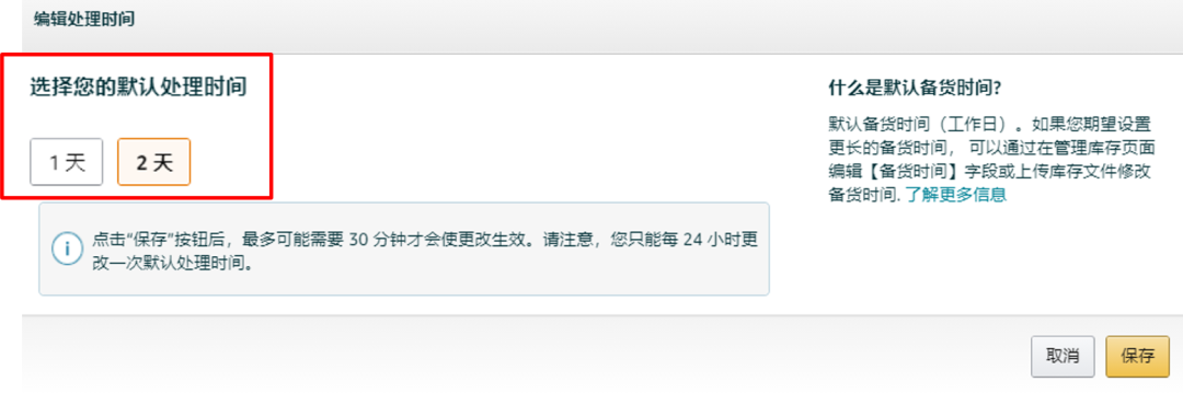 🚩请注意:在24小时内您只能更改一次默认备货时间。