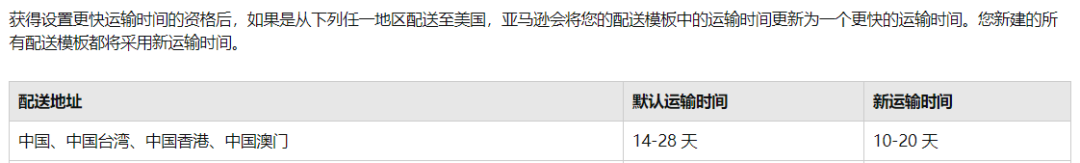 在获得可以设置更为准确的运输时间权限后,如果是从下列任一地区配送至美国,亚马逊会在您的配送模板中的运输时间新增一个更快的时间选项"10-20天"。您新建的所有配送模板都将采用新的运输时间。目前该更新仅在亚马逊美国站上线。