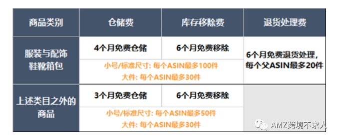 所有符合要求的亚马逊物流新 ASIN 均有资格享受免费月度仓储和免费移除服务。在亚马逊运营中心收到首件商品后 90 天内,对于前 50 件商品,亚马逊物流予以免除月度仓储费。在首批库存接收之日起的 180 天内,为前 50 件商品提供免费移除服务。