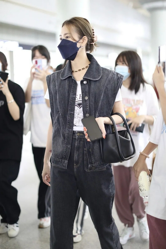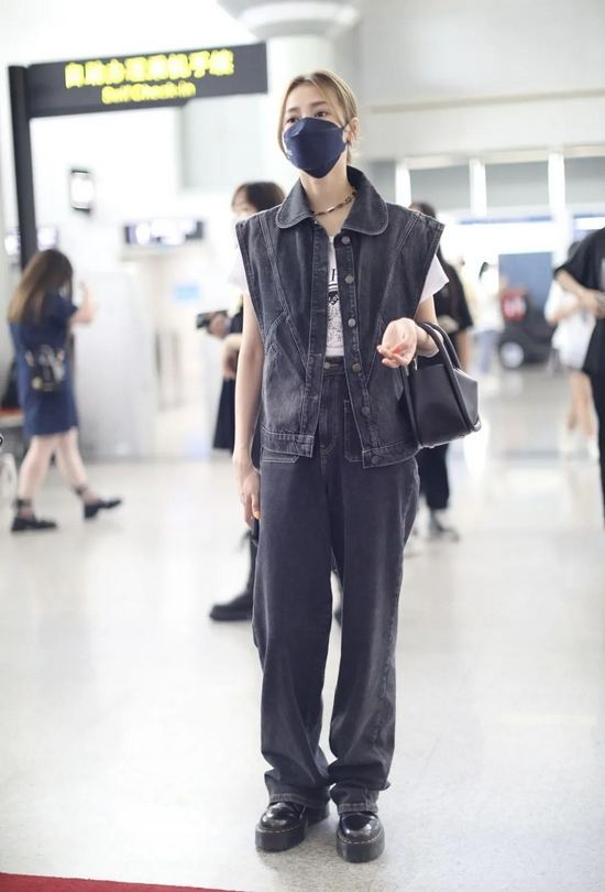 最后我们来看两个牛仔造型。首先弦子一身炭黑色的牛仔单品,显高显瘦之外,还发现了一个"隐藏技能"——超级显白。