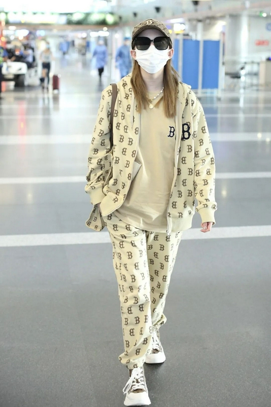 这套运动套装虽然看着花,但是米色系让整体造型保持了些许质感,还是很经得住细看的。至于棒球帽么,她选了配套的,从头酷到脚。