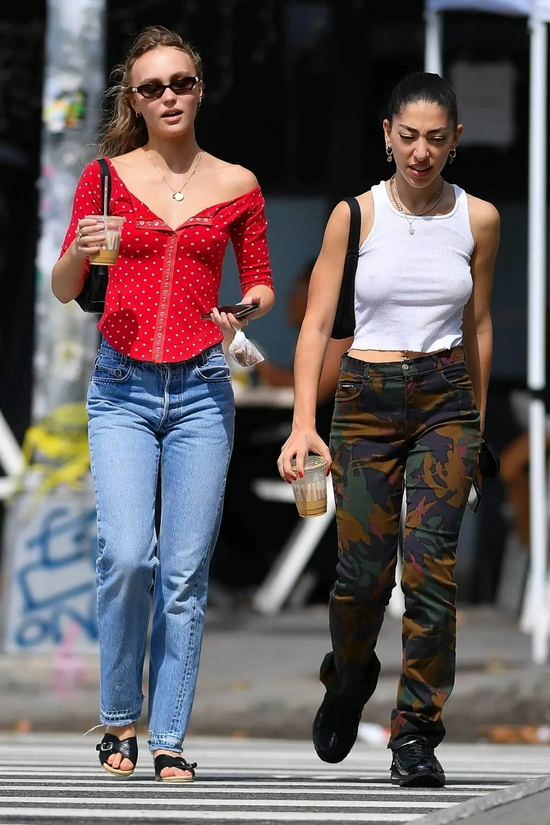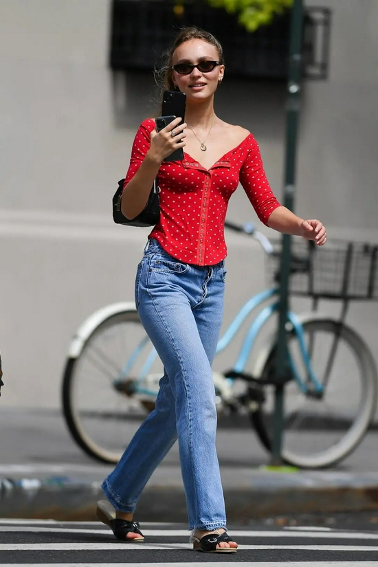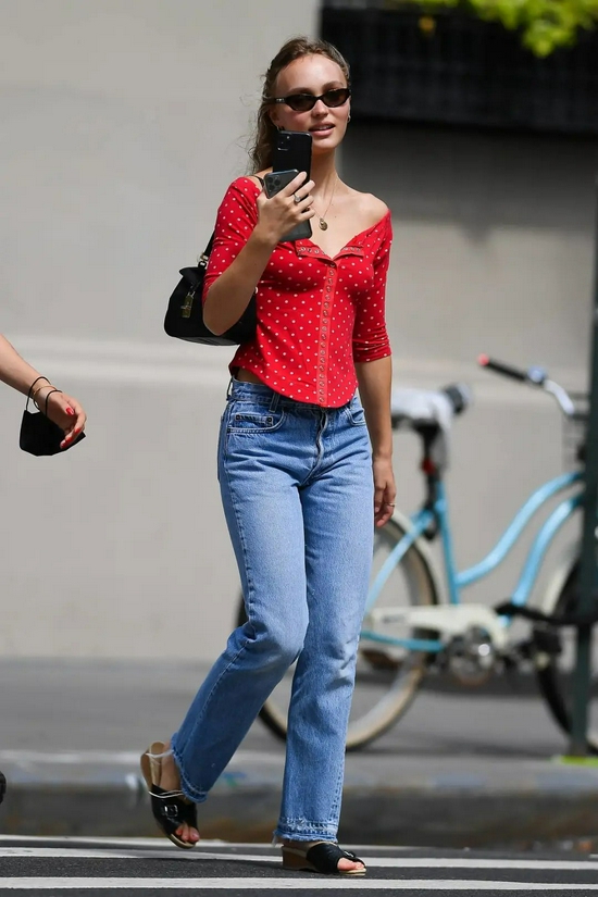 Lily Rose Depp这次总算精致出街吧。红色波点修身上衣够醒目的,随意散开胸前的几颗纽扣,就变成了一字肩,颜色也很法兰西,一枚多汁浪漫的树莓女孩。