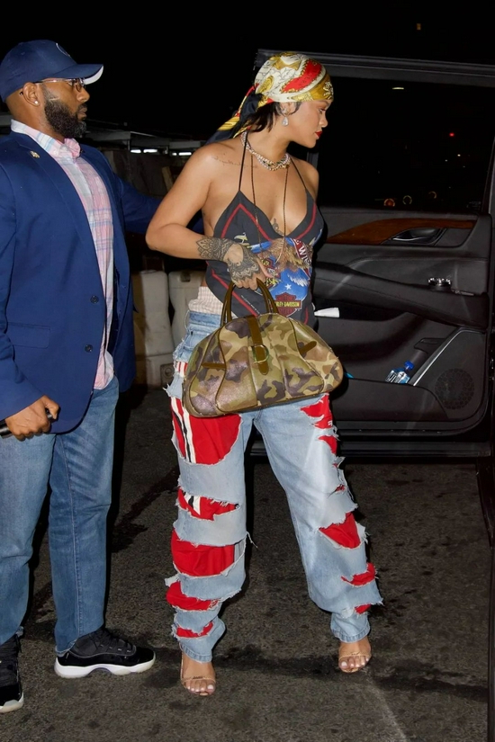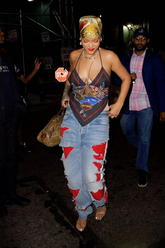 下装把运动裤和破洞牛仔裤做了结合,"内搭"居然还有一条男士内裤??真是会玩极了。日日还把高跟鞋绑带系在了牛仔裤外面,她混搭,总是如此精彩。