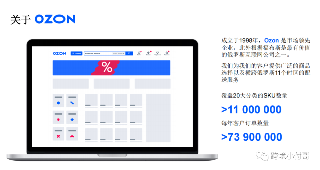 Ozon是俄罗斯最早的电子商务公司之一,被称为"俄罗斯的亚马逊"。平台SKU超500万,主要为在线销售图书、电子产品、音乐、电影等,是俄罗斯市场最大的多品类综合电商平台。