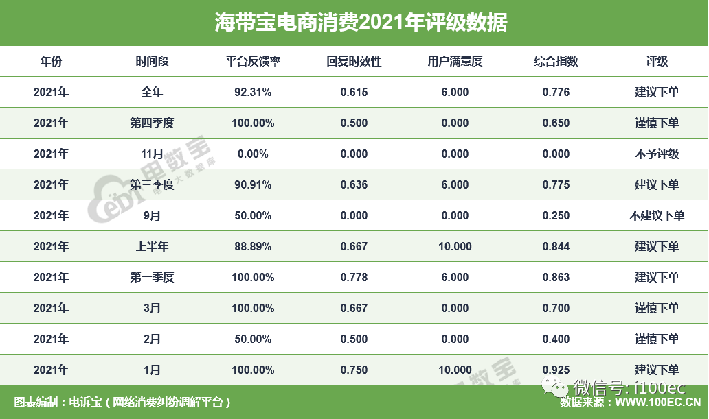 今天发布的是"海带宝"电诉宝消费评级数据。据"电诉宝"显示,2021年"海带宝"共获得10次消费评级,其中,5次获"建议下单"评级、3次获"谨慎下单"评级、1次获"不予评级"、1次获"不建议下单"评级,最终获"建议下单"评级。