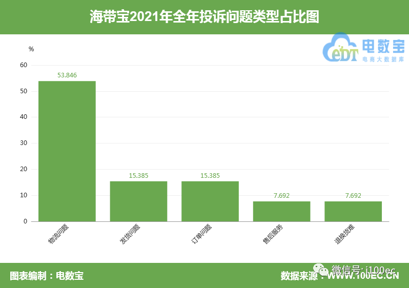 根据网经社旗下电商大数据库"电数宝"(DATA.100EC.CN)显示,"海带宝"存在物流问题、发货问题、订单问题、售后服务、退换货难的问题。