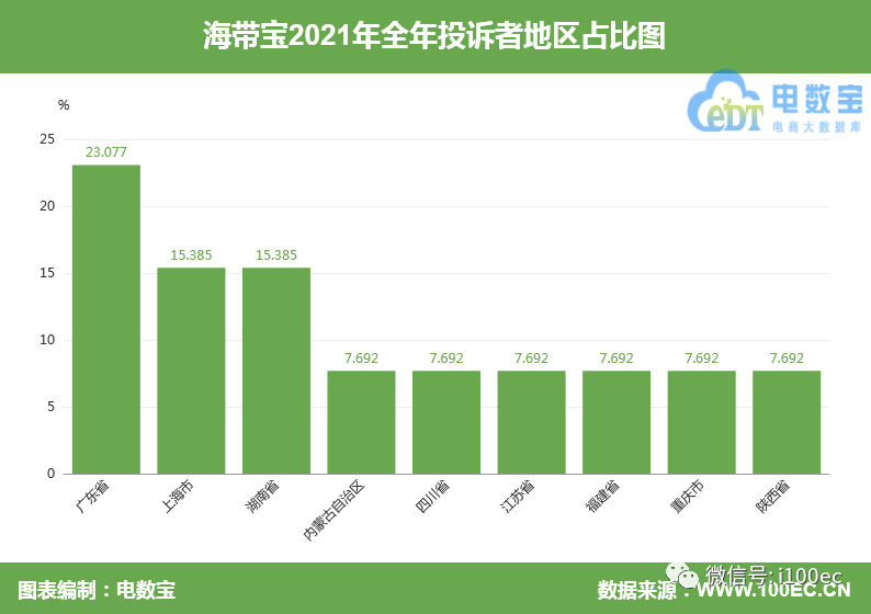 根据网经社旗下电商大数据库"电数宝"显示,2021年投诉"海带宝"的用户主要集中地区为广东省、上海市、湖南省、内蒙古自治区、四川省、江苏省、福建省、重庆市、陕西省。