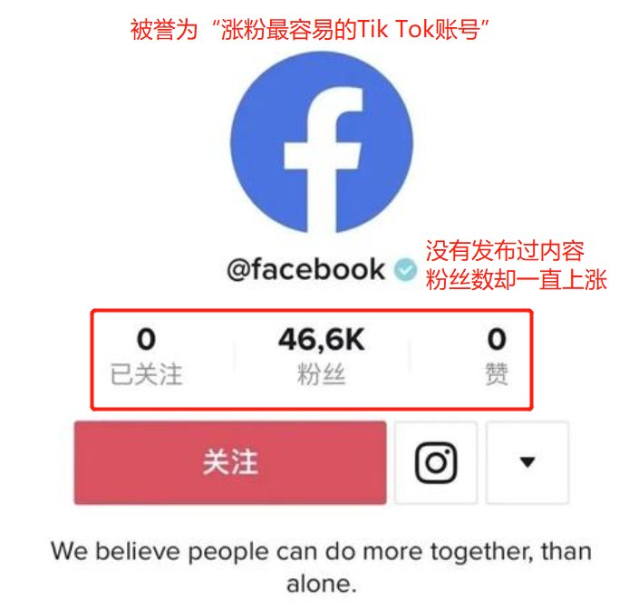Facebook在Tik Tok的主页上还有一句引人注目的标语"We believe people can do more together, than alone",翻译过来就是"比起独自一人,我们相信大家可以一起做更多事情"。