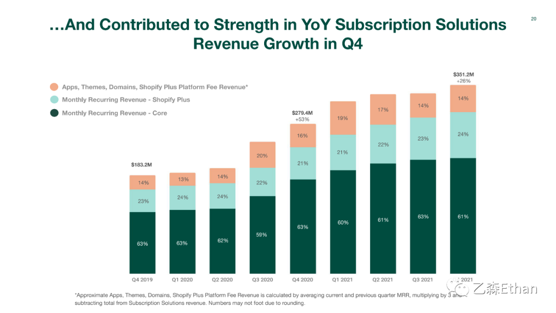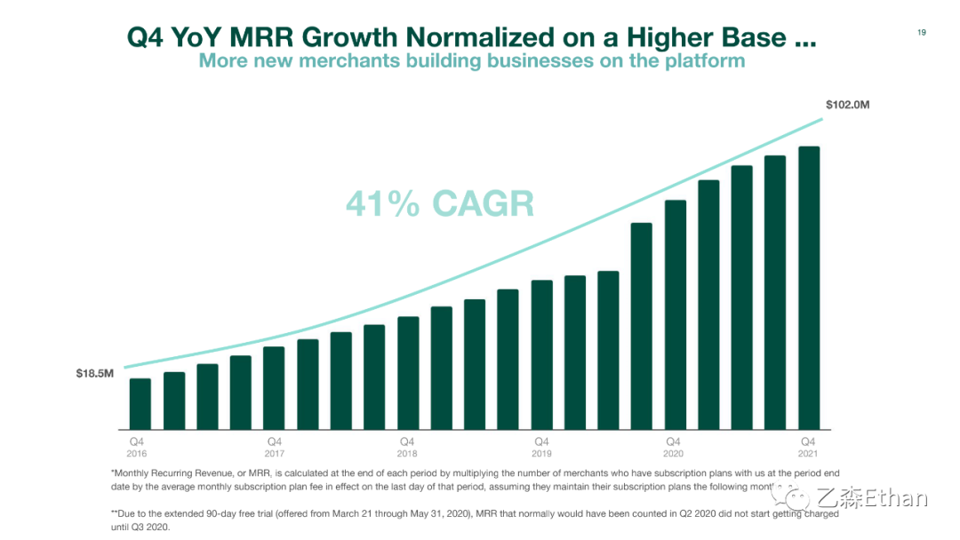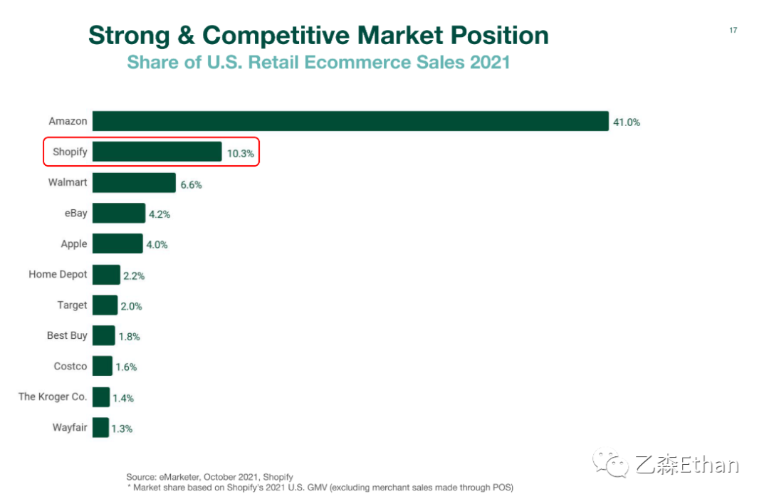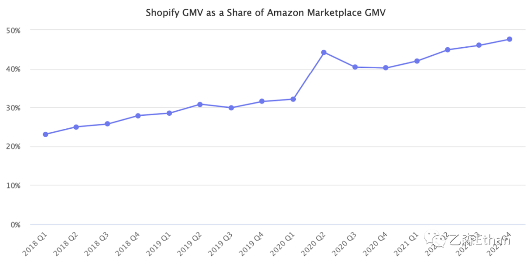 Shopify 2021 Q4的GMV超过540亿美元,现在的规模接近亚马逊市场的50%. 要知道,亚马逊市场在2018年是Shopify的四倍。