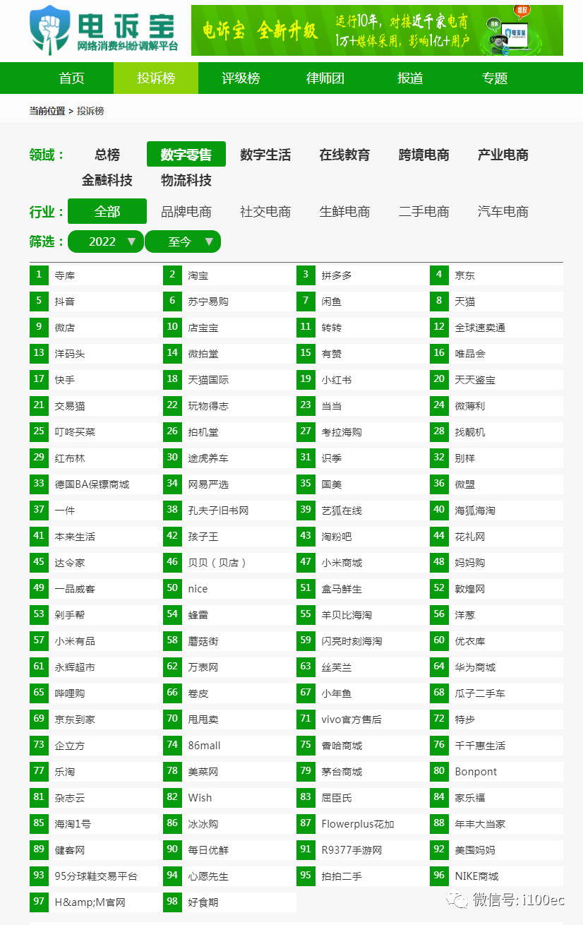 根据"电诉宝"受理的数字零售领域用户有效投诉显示(依据投诉量排行),店宝宝排名第十位,最新评级为"不予评级"。2022年至今,同样被投诉的类似平台有:寺库、淘宝、拼多多、京东、抖音、苏宁易购、闲鱼、天猫、微店、转转、全球速卖通、洋码头、微拍堂、有赞、唯品会、快手、天猫国际、小红书、天天鉴宝、交易猫、玩物得志、当当、微薄利、叮咚买菜、拍机堂、考拉海购、找靓机、红布林、途虎养车、识季、别样、德国BA保镖商城、网易严选、国美、微盟、一件、孔夫子旧书网、艺狐在线、海狐海淘、本来生活等。