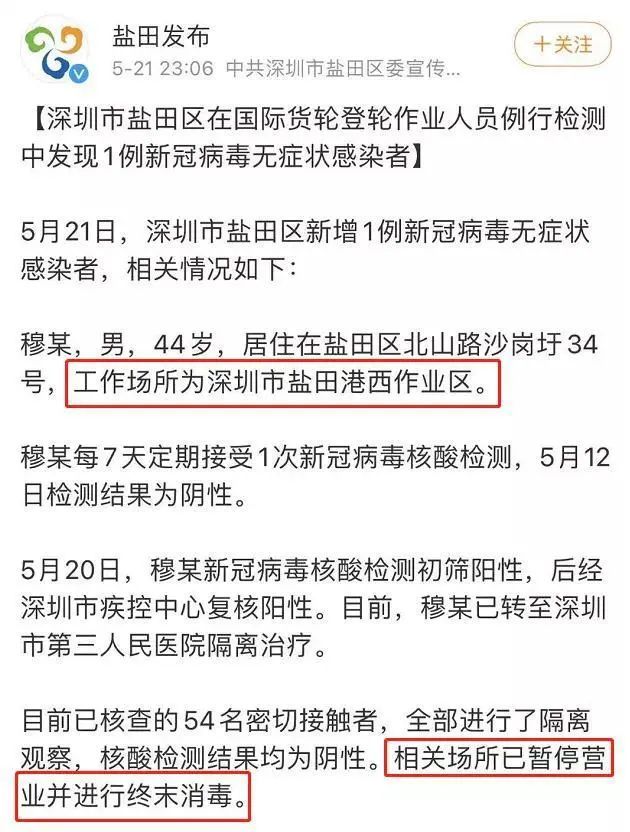 5月21日,深圳市盐田区新增1例新冠病毒无症状感染者,是国际货轮登轮作业人员。