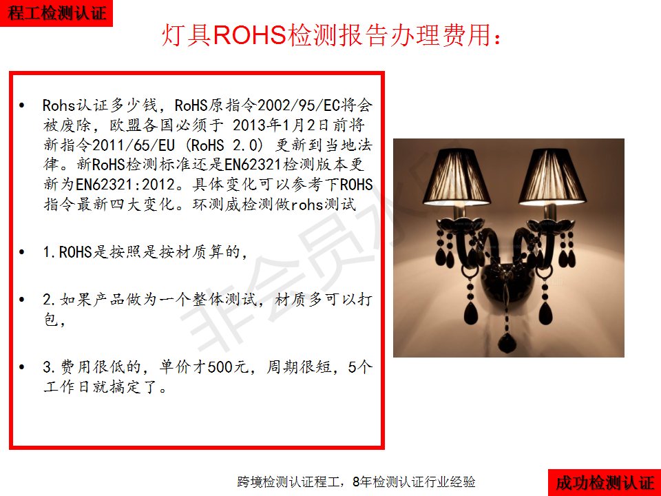 《RoHS指令》和《WEEE指令》规定纳入有害物质限制管理和报废回收管理的有十大类102种产品,前七类产品都是我国主要的出口电器产品。包括灯具、大型家用电器、小型家用电器、信息和通讯设备、消费类产品、照明设备、电器电子工具、玩具、休闲和运动设备、医用设备(被植入或被感染的产品除外)、监测和控制仪器、自动售卖机。以上是关于ROHS检测报告办理费用的相关资讯,寻找第三方检测机构一定要拥有CNAS/CM