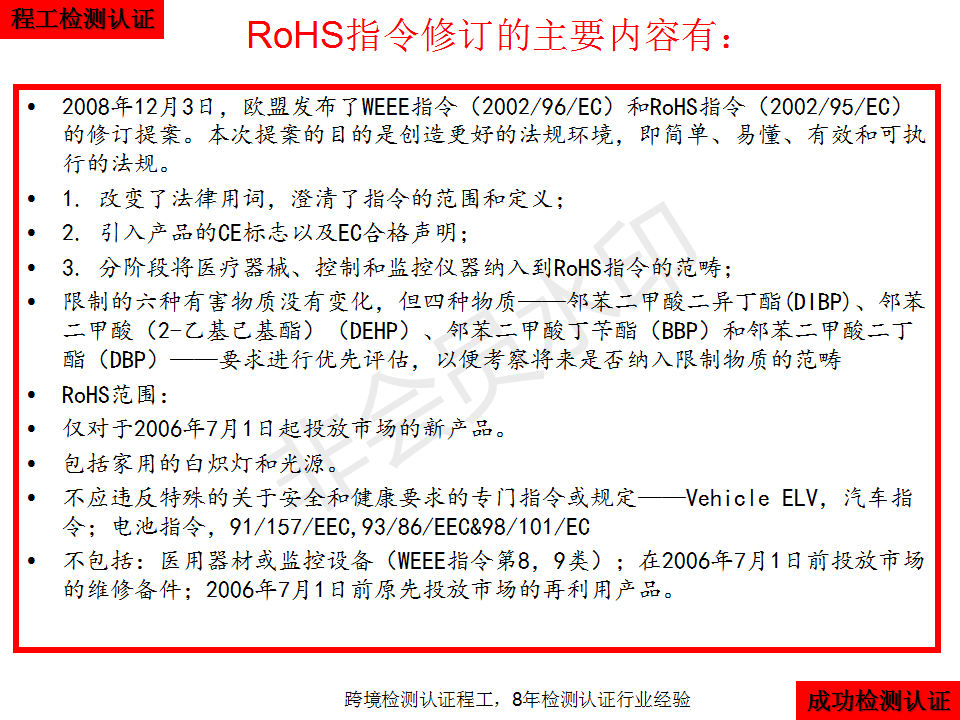 《RoHS指令》和《WEEE指令》规定纳入有害物质限制管理和报废回收管理的有十大类102种产品,前七类产品都是我国主要的出口电器产品。包括灯具、大型家用电器、小型家用电器、信息和通讯设备、消费类产品、照明设备、电器电子工具、玩具、休闲和运动设备、医用设备(被植入或被感染的产品除外)、监测和控制仪器、自动售卖机。