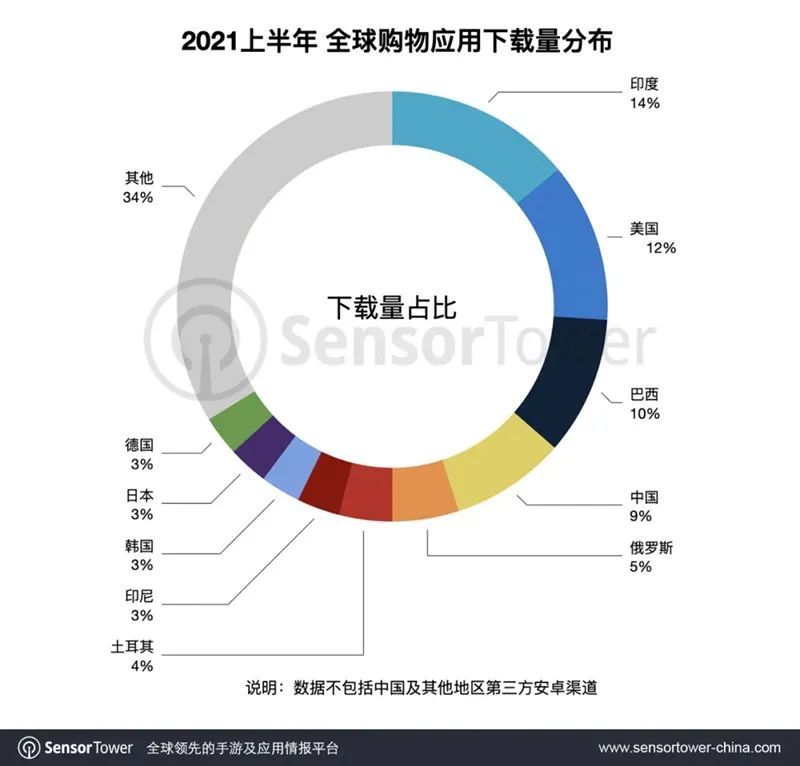 印度是下载量最高的市场,占 2021 上半年全球购物应用总下载量的 14%。美国和巴西市场紧随其后,分别占 12% 和 10%。