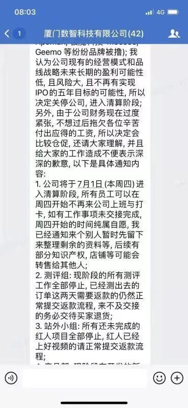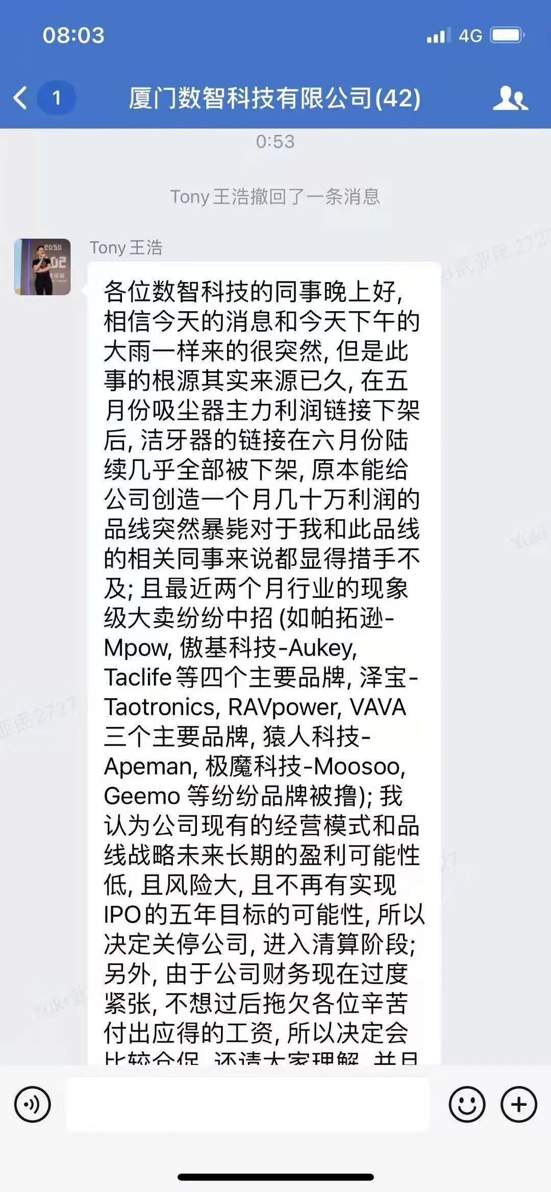 文|Connie十年不遇的行业巨震——亚马逊封号、下架产品,仍在持续中......10天前还在对外招聘针对Amazon的「站外推广」人员,而10天后的今天,就突然宣布关停公司。6月28日晚,又一跨境卖家——厦门数智科技有限公司决定关停公司,进入清算阶段。创始人Tony王浩在公司内部群组宣布:7月1日(本周四)起,公司进入清算阶段,所有员工可以在周四开始不再来公司上班与打卡。以下是其在公司内部群组发