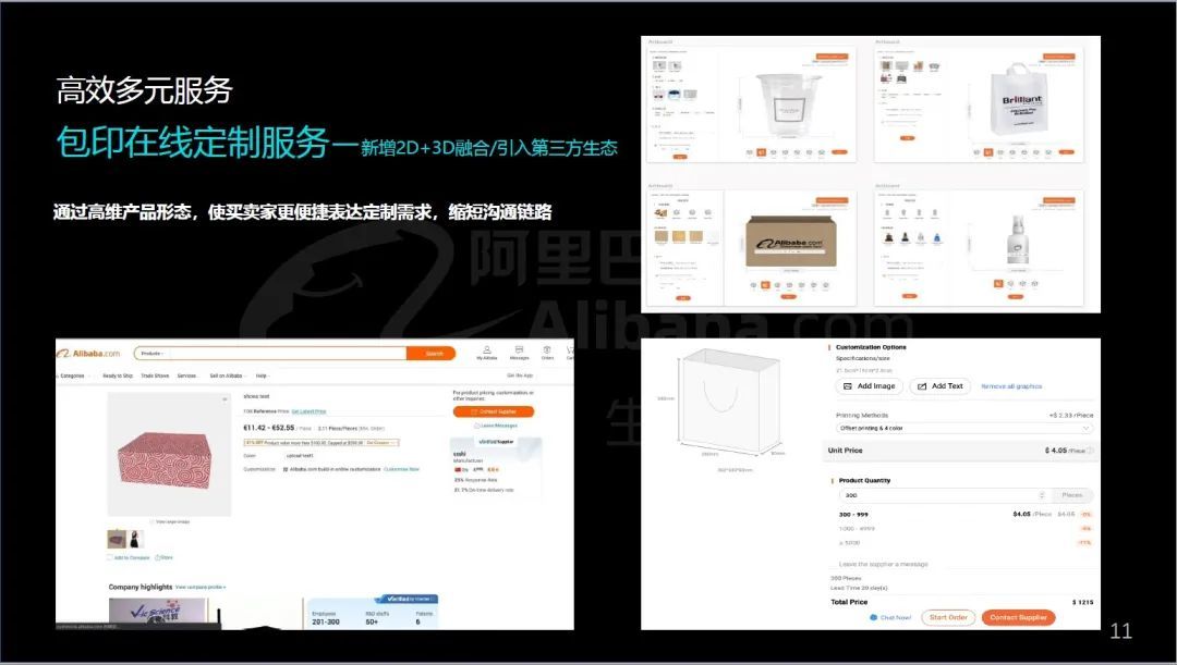 2、包印在线定制服务新增2D+3D融合,引入第三方生态等功能:通过高维产品形态,帮助买卖家更便捷地表达定制需求,缩短沟通链路,提升沟通效率。